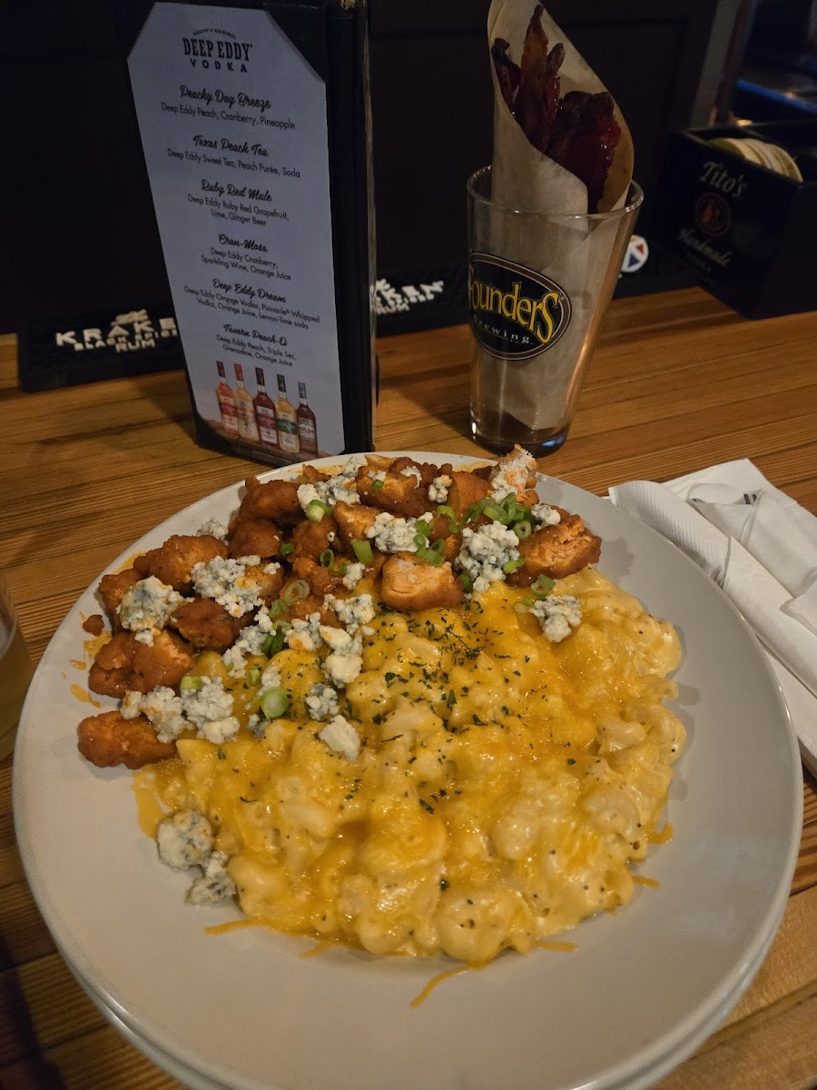 A straight pound of house fries covered in cajun seasoning, buffalo sauce, and bleu cheese crumbles, topped with green onion. Add crispy chicken $4